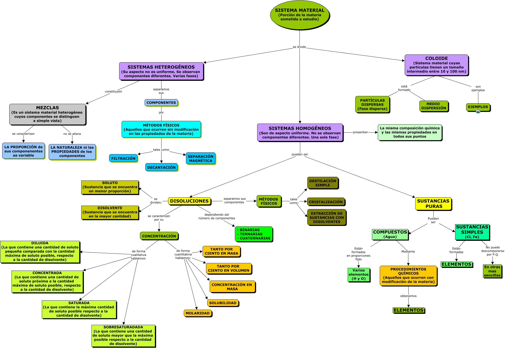 Este Cmap, tiene información relacionada con: sistema material, SISTEMA MATERIAL (Porción de la materia sometida a estudio) se divide SISTEMAS HOMOGÉNEOS (Son de aspecto uniforme. No se observan componentes diferentes. Una sola fase), CONCENTRACIÓN de forma cualitativa hablamos: SOBRESATURADADA (La que contiene una cantidad de soluto mayor que la máxima posible respecto a la cantidad de disolvente), COMPONENTES por MÉTODOS FÍSICOS (Aquellos que ocurren sin modificación en las propiedades de la materia), PROCEDIMIENTOS QUÍMICOS (Aquellos que ocurren con modificación de la materia) obtenemos ELEMENTOS, MEZCLAS (Es un sistema material heterogéneo cuyos componentes se distinguen a simple vista) se caracterizan LA PROPORCIÓN de sus componenentes es variable, MÉTODOS FÍSICOS (Aquellos que ocurren sin modificación en las propiedades de la materia) tales como FILTRACIÓN, CONCENTRACIÓN de forma cualitativa hablamos: SATURADA (La que contiene la máxima cantidad de soluto posible respecto a la cantidad de disolvente), DISOLUCIONES se caracterizan por su CONCENTRACIÓN, DISOLUCIONES se dividen: DISOLVENTE (Sustancia que se encuentra en la mayor cantidad), COLOIDE (Sistema material cuyas partículas tienen un tamaño intermedio entre 10 y 100 nm) son ejemplos EJEMPLOS, MÉTODOS FÍSICOS tales como: EXTRACCIÓN DE SUSTANCIAS CON DISOLVENTES, MEZCLAS (Es un sistema material heterogéneo cuyos componentes se distinguen a simple vista) no se altera LA NATURALEZA ni las PROPIEDADES de los componentes, CONCENTRACIÓN de forma cualitativa hablamos: DILUIDA (La que contiene una cantidad de soluto pequeña comparada con la cantidad máxima de soluto posible, respecto a la cantidad de disolvente), SUSTANCIAS SIMPLES (Cl, Fe) No puede descomponerse por P.Q. En otras mas sencillas, SISTEMAS HETEROGÉNEOS (Su aspecto no es uniforme. Se observan componentes diferentes. Varias fases) constituyen MEZCLAS (Es un sistema material heterogéneo cuyos componentes se distinguen a simple vista), MÉTODOS FÍSICOS (Aquellos que ocurren sin modificación en las propiedades de la materia) tales como DECANTACIÓN, SISTEMA MATERIAL (Porción de la materia sometida a estudio) se divide COLOIDE (Sistema material cuyas partículas tienen un tamaño intermedio entre 10 y 100 nm), MÉTODOS FÍSICOS tales como: CRISTALIZACIÓN, DISOLUCIONES dependiendo del número de componentes - BINARIAS - TERNARIAS - CUATERNARIAS, SUSTANCIAS PURAS Pueden ser SUSTANCIAS SIMPLES (Cl, Fe)