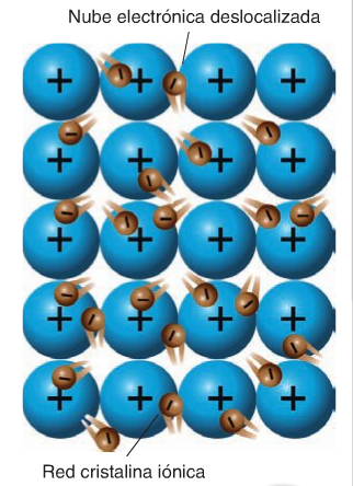 BROMO </mtext> </mrow> </math>, AGREGADOS IONES Forman: CRISTALES IONICOS, ENLACE COVALENTE formando CRISTALES (Elementos no metálicos), CLORURO DE SODIO (NaCl) Sus propiedades son: 1.- Poseen altos puntos de fusión y ebullición. 2.- Presentan una gran dureza o dificultad a ser rayados 3.- No conducen la electricidad en estado sólido. 4.- Conducen la electricidad cuando están fundidos. 5.- Se disuelven muy bien en agua. 6.- Las disoluciones acuosas conducen la electricidad., COMPARTIENDO SUS ELECTRONES Formando: MOLÉCULAS DIATÓMICAS, AGUA CLORURO DE HIDRÓGENO AMONIACO METANO DIÓXIDO DE AZUFRE DIÓXIDO DE CARBONO Se caracterizan por: 1.- La mayoria son gaseosos a temperatura ambiente. 2.- Tienen bajos puntos de fusión y ebullición. 3.- No conducen la electricidad., METALES Sus propiedades: 1.- La mayoría son muy duros. (Los átomos están unidos de forma compacta) 2.- Son dúctiles y maleables. (Se dejan estirar en hilos y es posible mover una capa sobre otra) 3.- Conducen la corriente eléctrica. (Los electrones se pueden mover con facilidad a través de la red), ENLACE COVALENTE formando MOLÉCULAS (Elementos no metálicos), AGRUPACIÓN DE LOS ÁTOMOS EN LA MATERIA pueden agruparse formando COMPUESTOS (Sustancia pura formada por dos o más elementos diferentes combinados en siempre en proporciones efijas), <math xmlns="http://www.w3.org/1998/Math/MathML"> <mrow> <mtext> HIDRÓGENO