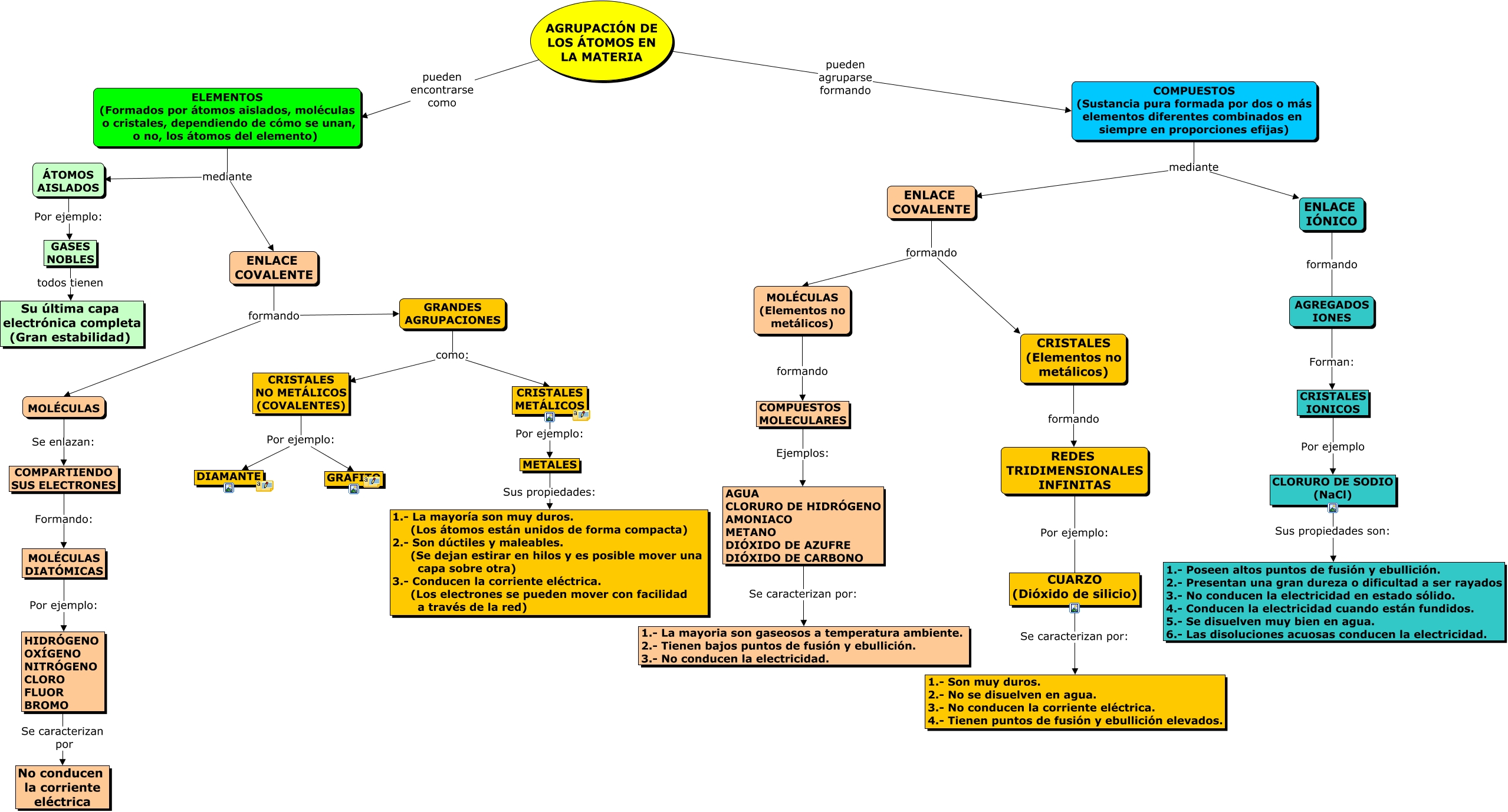 Este Cmap, tiene información relacionada con: formas de agrupar átomos, COMPUESTOS (Sustancia pura formada por dos o más elementos diferentes combinados en siempre en proporciones efijas) mediante ENLACE IÓNICO, ELEMENTOS (Formados por átomos aislados, moléculas o cristales, dependiendo de cómo se unan, o no, los átomos del elemento) mediante ÁTOMOS AISLADOS, MOLÉCULAS Se enlazan: COMPARTIENDO SUS ELECTRONES, CRISTALES METÁLICOS Por ejemplo: METALES, CRISTALES NO METÁLICOS (COVALENTES) Por ejemplo: DIAMANTE, CRISTALES NO METÁLICOS (COVALENTES) Por ejemplo: GRAFITO, ENLACE IÓNICO formando AGREGADOS IONES, AGRUPACIÓN DE LOS ÁTOMOS EN LA MATERIA pueden encontrarse como ELEMENTOS (Formados por átomos aislados, moléculas o cristales, dependiendo de cómo se unan, o no, los átomos del elemento), GRANDES AGRUPACIONES como: CRISTALES METÁLICOS, MOLÉCULAS DIATÓMICAS Por ejemplo: <math xmlns="http://www.w3.org/1998/Math/MathML"> <mrow> <mtext> HIDRÓGENO
